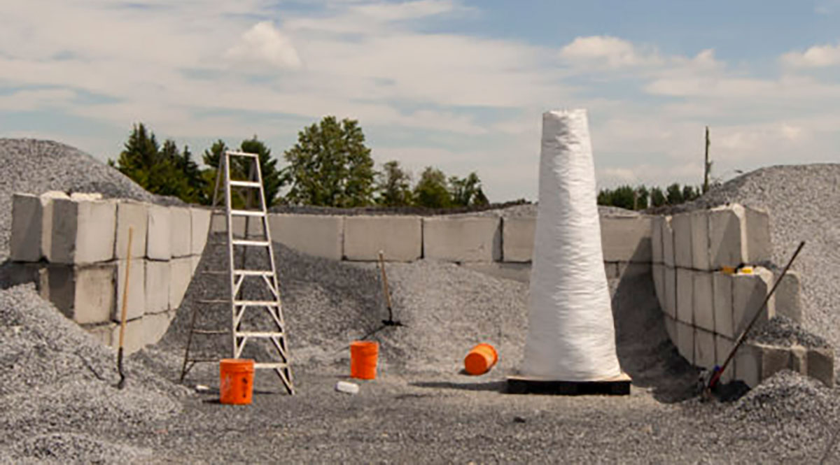 Mines which supply sand for concrete creation are notoriously harmful to the environment. And concrete create generated 8% of Earthās greenhouse gases in 2016. Design research team YYY-MM-DD featured a prototype of a column that can be made from crushed construction waste found nearby any building site. The Another Column project recasts the sandbag. It is based around the use of a large-scale empty bag that is easily transported to site, but once filled it becomes a structural object.