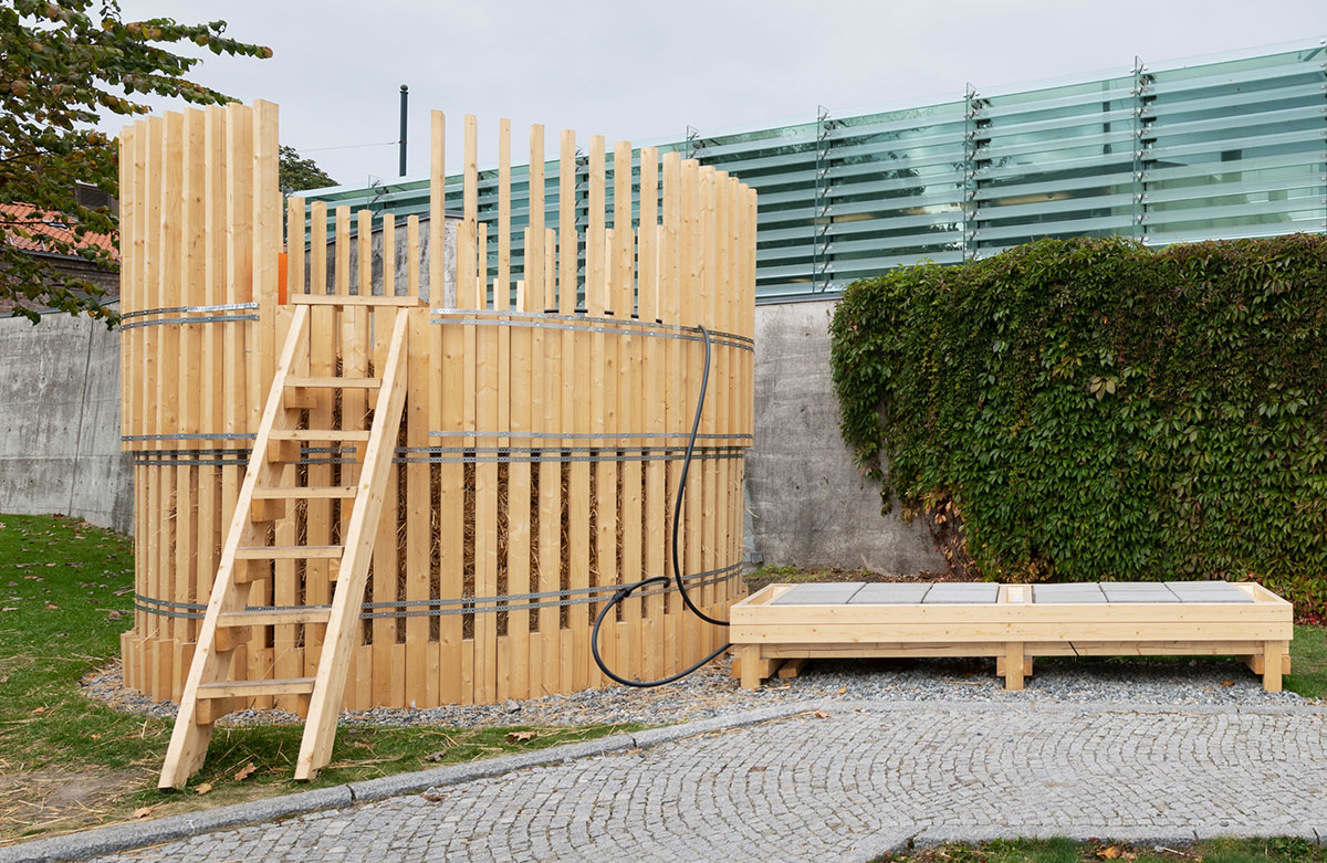 London-based design studio Public Works, in collaboration with the Oslo School of Architecture students and Flakk/Dalziel, modelled this at the Triennale with the Power Plant! installation where a water heating system is passively heated by compost to warm up the seats of a nearby bench for extra comfort on a cold day.